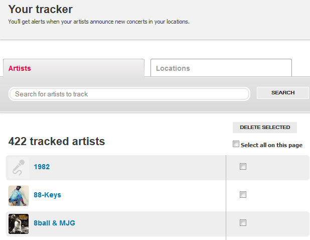 Fig. 1 – Screenshot of my artist tracker on songkick.com