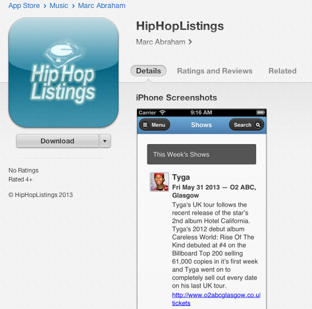 Fig. 1 – My own HipHopListings app in iTunes