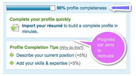 1. Behaviourism looks at what people actually do – Behaviourism is highly empirical and it focuses solely on those things that can be tested. In other words, trying to get into a person’s head is off-limits under the behaviourist model. ‘Observation’ and ‘feedback loops’ are two tangible artefacts of the behaviourist approach. A good example of a feedback loop is LinkedIn’s progress bar, which shows users their progress with respect to completion of their LinkedIn profiles (see Fig. 2 below).