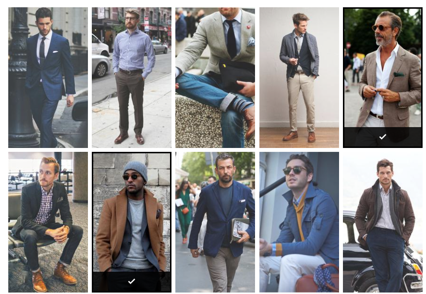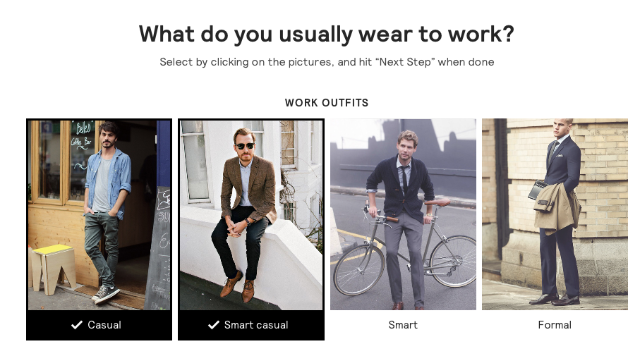 - Getting started, what’s the sign-up process like (4)? – Even though I had pressed “Done” after uploading my photos, I was nevertheless presented with another step: “What do you usually wear to work? Select by clicking on the pictures, and hit “Next Step” when done” (see Fig. 5 below). Perhaps others may well consider my next suggestion superfluous, but how about adding that one can select as many styles as they like? Not only would this be consistent with the copy used for previous steps but it would also work well with the scenario whereby men dress smart 4 days per week, apart from on ‘Casual Fridays’.