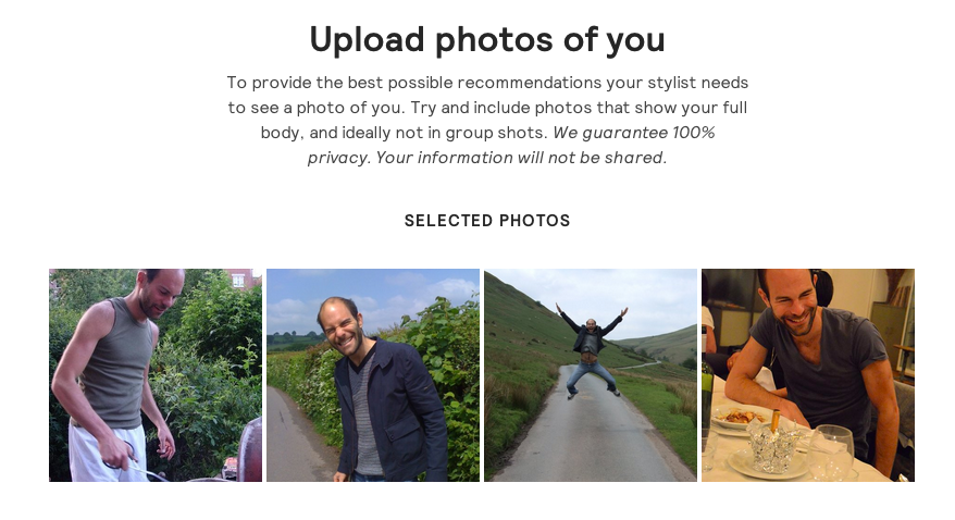 - Getting started, what’s the sign-up process like (3)? – The next step, selecting the brands that I wear, felt easy and intuitive (see Fig. 3 below). I picked a few brands and added a brand that wasn’t on the list. I was then asked to upload some photos of myself (see Fig. 4 below). Perhaps I had missed it when I first arrived on the site, but for me this was the first point where I started to understand where all the previous steps were taking me; enabling a dedicated stylist to provide me with recommendations tailored to my style and brand preferences. It wasn’t clear, however, from the explanatory text what would happen if I didn’t upload a picture of myself. Would the stylist recommendations be less good? Would the whole process come to a halt? It might be an idea to have an explanatory text which appears when a user hovers over the “Skip” button. The actual photo upload process from Facebook was very straightforward.