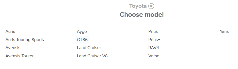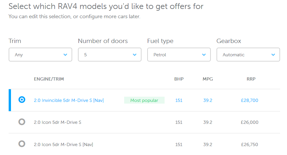 - Getting started, what’s the process like (1)? – I start the process by clicking on the “Choose car” button (see Fig. 3 below). I then choose a make. Whilst doing this I was thrown slightly by the fact it also mentions “next choose a model”; I wasn’t sure whether I needed to click on this (it turned out to be non-clickable) or whether this was just a signpost, meant to give an indication of the next step (see Fig. 3 below). Indeed, once I’ve chosen a make (Toyota), I need to choose a model (see Fig. 4 below). I then select an engine (petrol or diesel) and a gearbox (automatic or manual), after which I’m presented with a screen through which I can indicate which models I’d like to receive offers for (see Fig. 5 below).