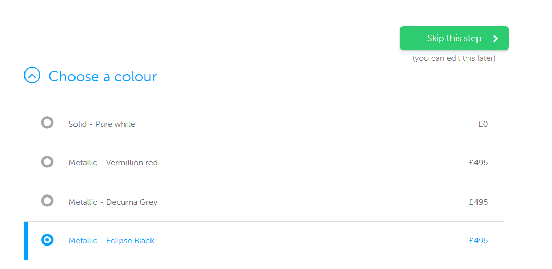 Fig. 6 – Choose a colour and any extra features through Carwow, followed by a recommended retail price: