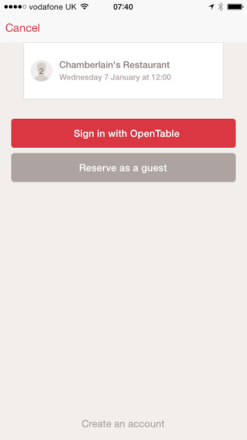 Fig. 7 – Screenshot of the step prior to making a booking through the OpenTable iOS app