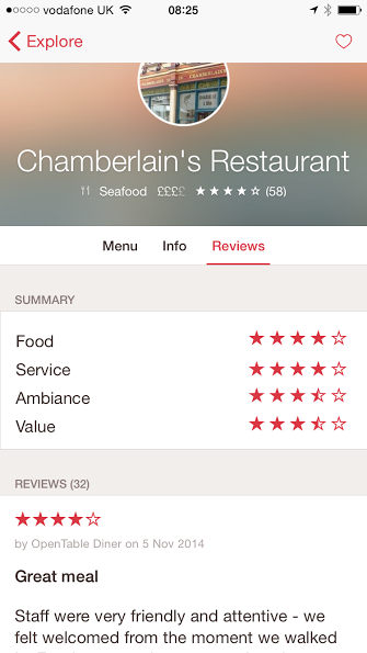 4. Getting started, what’s the process like (1)? – I first decided to change the default setting from “Table for 2, today at 12:00” to 2 people on Sun 25 Jan at 12:00. I then select “Chamberlain’s Restaurant” at 12:00, after which I get presented with a nice landing page for Chamberlain’s Restaurant (see Fig. 3 below). By default, the “Info” view is displayed for a restaurant, which means that the view offers practical info such as price range, cuisine and parking. When I switch to the “Reviews” view, I see that the restaurant is rated based on four criteria: food, service, ambiance and value (see Fig. 4 below).