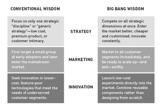 • Undisciplined Strategy – Undisciplined Strategy means that, rather than concentrating one’s market entry strategy on a specific aspect – operational excellence, product leadership or customised offerings – Big Bang Disruptors will try to compete on all three strategic values at one. They will offer products or services that are both better and cheaper than the incumbents.