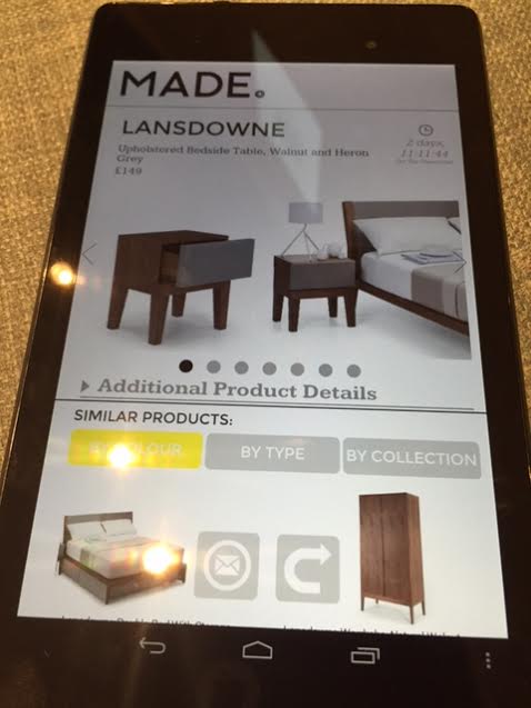 - Product discovery – I really liked the product pages that came up on the handheld device as I was scanning CloudTags on products. For example, when I scanned a “Landsdowne Upholstered Bedside Table”, I got a product page which was clear, visual and which encouraged me to look at similar products (see Fig. 3 below). From this product page, I found it really easy to look at the bedside table in different colours and to explore different products by type and collection respectively. Also, the email that I got from Made.com included both the item that I’d looked at as well as “recommended products” (i.e. other items in the Landsdowne collection).