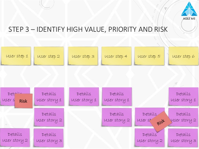 7. Exposing risk in the story map – For me, being “Lean” is all about managing risk. User story mapping can help you to identify and mitigate risk early on in the product development process. Story maps are a great way to make risks visible (see Fig. 6 below) and serve as a starting point for a conversation about how to best manage risk.