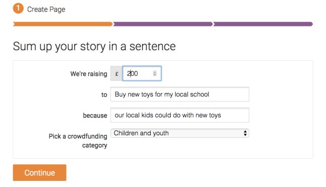 - Getting started, what’s the process like? (1) – At the bottom and the top of the JustGiving Crowdfunding homepage there’s an orange button which says “Raise money” (see Fig. 3 below). After clicking on this orange button I land on a page which is clearly marked as step 1 “Create Page”, followed by a “Sum up your story” tagline. However, when I look at what I think is meant as a progress bar at the top of this page, I’m unsure about the number and nature of subsequent steps involved. Assuming that a large proportion of people using JustGiving Crowdfunding will be doing so for the first time or won’t be raising funds online on a regular basis, I believe it would be helpful to the user if the progress bar included (a) the step the user is currently on – highlighted – and (b) subsequent steps involved in creating a page – with a progress number and brief description. Another suggestion would be to explain to the user why JustGiving uses a £200 fundraising target threshold. When I – unknowingly – entered £100 as my fundraising target, I got an error message which stated “Sorry, please make sure your target is at least £200” (see Fig. 5 below). As a user, it would be good to understand the rationale behind this threshold.