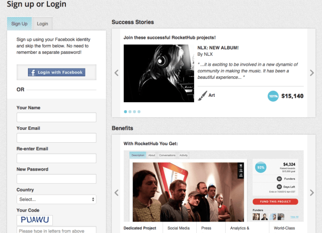 Fig. 12 – Screenshot of RocketHub’s login/sign up page
