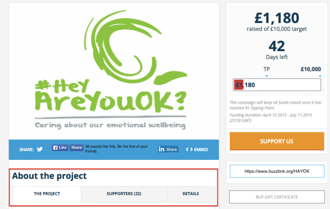 - How does the site compare to similar sites? (2) – The experience on Razoo feels similar to JustGiving Crowdfunding, and is aimed at individuals and organisations which wish to raise funds for specific projects. I like the “Also Fundraising for this Cause” section which showcases other individuals or organisations raising funds for the same project. Buzzbnk is another good example of a competitor who focuses on “Positive people backing bright ideas”. Each Buzzbnk fundraising page has a nice, tabbed “About the project” section (see Fig. 14 below). The Buzzbnk site seems to focus more on ‘discovery’ than JustGiving Crowdfunding currently does.