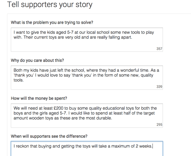 Fig. 9 – “Tell supporters your story” section – with fictitious example