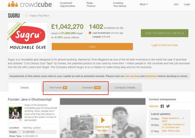 - Did the site deliver on my expectations? – Overall, the experience on JustGiving Crowdfunding feels simple and intuitive. However, I do feel that the site can do better in guiding people through the process, explaining exactly what needs to be done (and why) in order to raise funds for one’s social projects. For example, platforms like Kickstarter and RocketHub do this pretty well. Also, JustGiving Crowdfunding’s site feels a bit light with respect to two things. Firstly, the social aspect involved in raising funds for projects, really creating a community around certain projects – LinkedIn and Crowdcube (see Fig. 16 below) are doing this pretty successfully. Secondly, I believe thatJustGiving Crowdfunding can do more to encourage people to find and explore new projects or organisations to which one can pledge money. Buzzbnk are doing this well and there are other non competitive examples such as Meetup.com which is a great example of a business enabling discovery in a smart way.