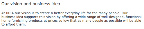 What a product vision isn’t? – A product vision isn’t a strategy nor is it a plan to achieve business or user goals. As I mentioned above, the product vision provides ‘direction’ and a framework to make decisions against. I believe that a good product vision offers a set of beliefs that can be tested and fits in with company values. A good example is IKEA, where “low prices” form a core part of its overarching vision statement. From a product development perspective, this means that the price tag is the first thing that needs to be designed when creating a new product:
