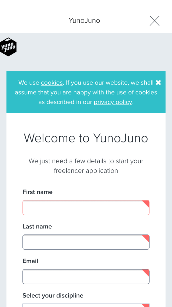 Fig. 2 – Screenshot of the freelancer signup form on the YunoJuno iOS app