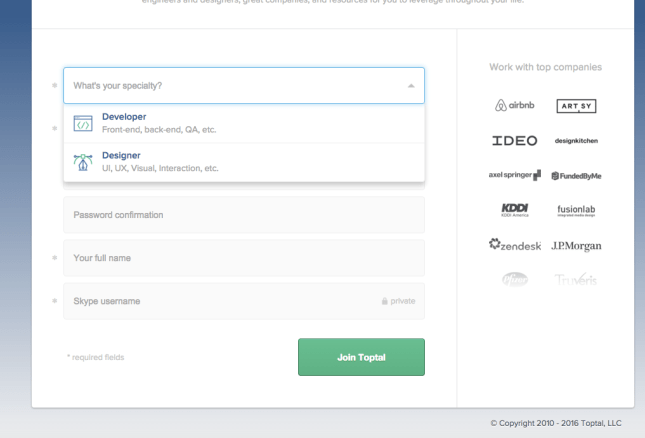 From looking at other YunoJuno competitors, it was Toptal that felt the most similar to YunoJuno, as Toptal only offers experienced freelancers. The Toptal homepage states that it has the “top 3% of freelance talent” on its platform. The main difference with YunoJuno, however, is that it only focuses on developers and designers (see Fig. 7).