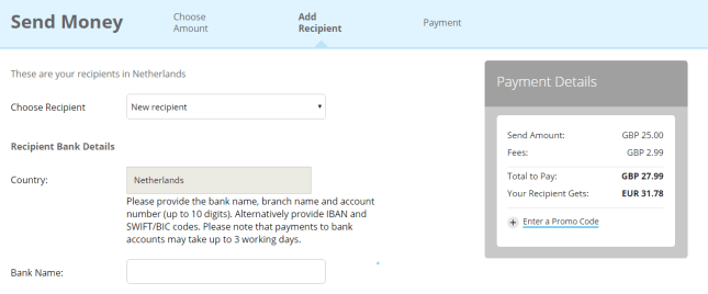 - Getting started, what’s the process like (1)? – Not hard at all. After I’ve selected the country and clicked on “get started”, I can enter an amount that I would like to send or receive. As soon as I then click on “send”, the amount I’m sending is automatically listed in British pounds. The only, minor, thing which threw me somewhat was that I thought I could select another service instead just of “bank transfer” because of the dropdown next to it. However, when I click on the dropdown, I just see “Select a service” and there aren’t other options to choose from.