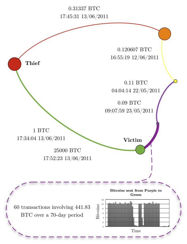 I read an interesting article about how anonymous users and their transactions can still be identified, tracking users’ activity both in real-time and historically. There are a number of centralised services within the blockchain e.g. wallets and exchanges which have access to user and transaction info. Also, by doing an activity or user network analysis, one can find out more about the type of transaction and the identity of the users involved (see example in Fig. 1 below).
