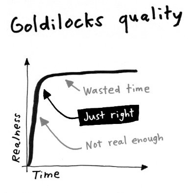I love the concept of “Goldilocks quality”, which was introduced by Daniel Burka. Burka argues that the ideal prototype should be of Goldilocks quality. If the quality is too low, people won’t believe the prototype is a real product. If the quality is too high, you’ll be working all night and you won’t finish. You need Goldilocks quality; not too high, not too low, but just right (see Fig. 3 below).