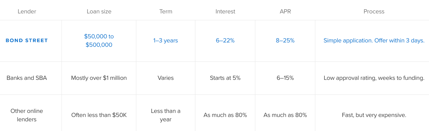 Fig. 1 – Loan size, rate and terms comparison between Bond Street and other small business lenders