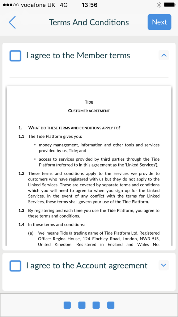 After contacting Tide, the issue gets resolved and I continue the onboarding process. “Terms And Conditions” is the next step I’m presented with. The calls to action are clear and I like how I can easily read through Tide’s “Member Terms” and “Account Agreement” if I wish to.
