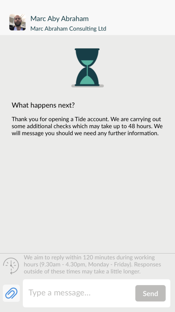After clicking both tick boxes, I receive a notification stating that my account has been opened, but that Tide needs to do some extra checks before creating a sort code and account number for me. I suspect this is due the fact that my driving license is still registered to my old address and doesn’t correspond with my company address.