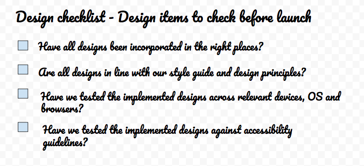 Checklists are a collective effort – I’m currently onboarding a new UX designer into my team, and he’s keen for us to look at the ‘design checklist’ together, as he’s got some suggestions on how to make it work better. This might mean that the existing design checklist (see Fig. 2 below), underpinned by my preferred dual track approach, might be binned or adapted accordingly. Both are fine, as I expects checklists to be formed by those people who are responsible for checking the different list items. I’ve seen people treat their individually developed checklists as a decree … which others had to following blindly. My simple reaction to that kind of approach: no, no, no, no.