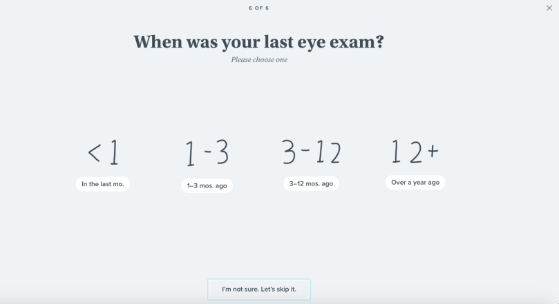 It’s good that I’m then being asked about my last eye exam. Wondering if and when I’ll be asked for the results from my last eye test in order to determine the strength of the glasses I need.