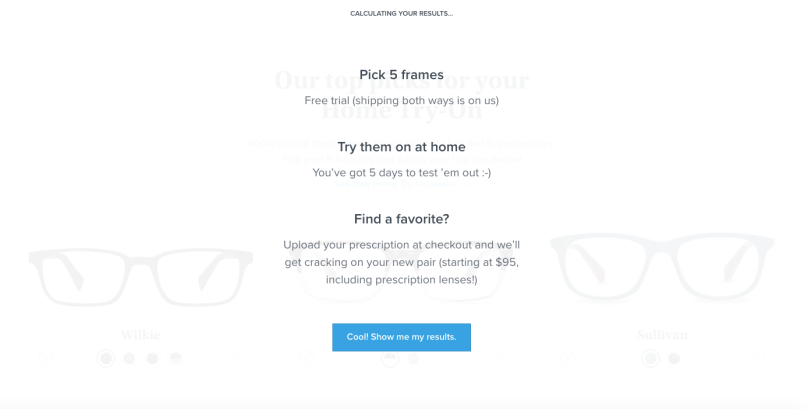 The next holding screen is useful since up to this point I hadn’t been sure about how Warby Parker’s service works. The explanations are clear and simple, encouraging me to click on the “Cool! Show me my results.” call to action at the bottom of the screen. I now understand that I can upload my prescription at checkout, but I wonder if I need to go to an eye doctor or an optician first in order to get a recent (and more reliable) prescription …
