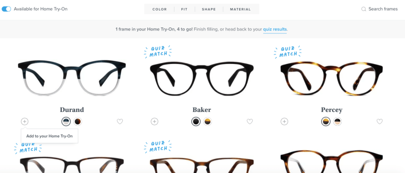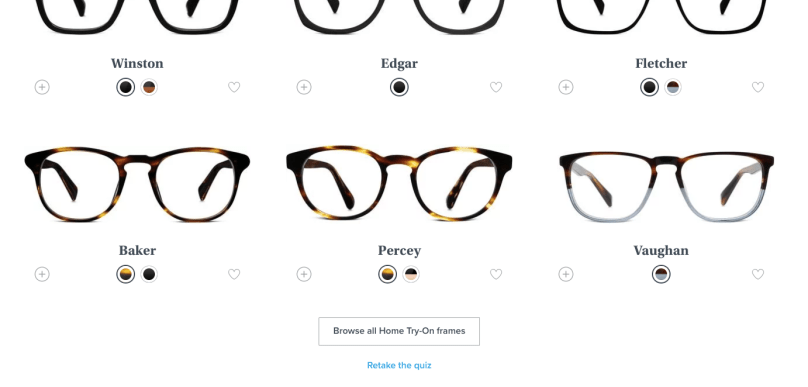 I’m then presented with 15 frames to choose from. From these 15 frames, Warby Parker lets me pick 5 frames to try on at home. I like how I can view the frames in the different colours that I selected as part of step 4 (see above). If I don’t like the frames suggested to me, I can always click “Browse all Home Try-on frames” or “Retake the quiz”.