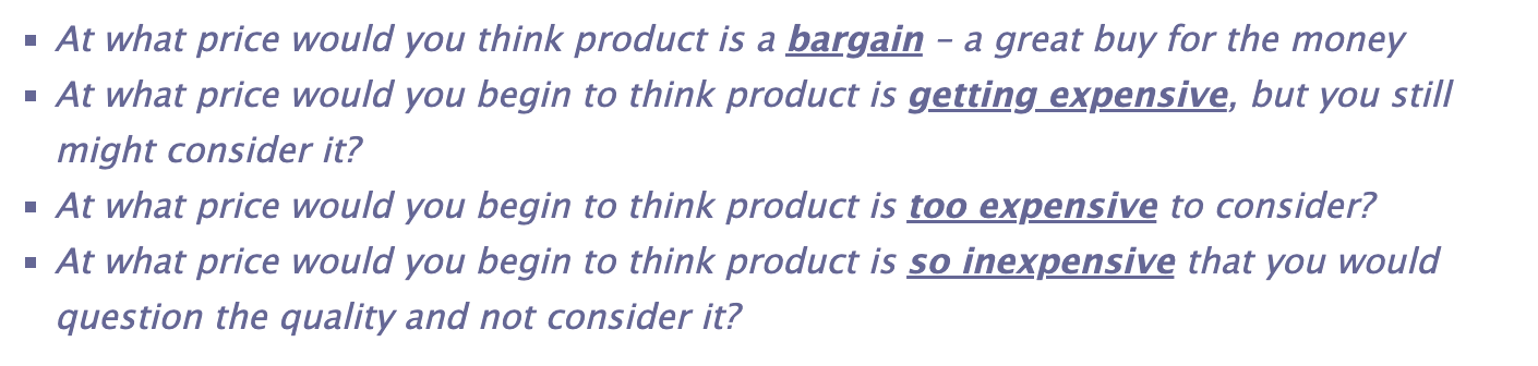 The insights from applying these direct questions will help in better understanding price points. The Van Westendorp method identifies four different price definitions: