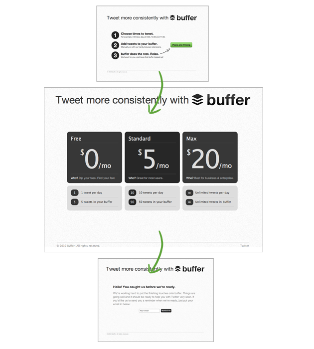 For example, sometimes it’s not clear whether customer want what it is that we’re going to build and it can be very risky to simply think “we’ll build it and customers will come.” In the book, Cagan talks about how you can quickly and cheaply test whether there’s demand for instance through launching just a landing page. On the landing page, we describe the new offering exactly as we would if we were really launching the service. The difference is that if the user clicks the call to action, rather than getting the expected outcome, the users sees a message that explains that you’re thinking of launching the new service and that you’d love to get initial input from the user. It all falls under the mantra “Do Things that Don’t Scale”, first introduced by Paul Graham, founder of Y Combinator. A good example is this one from Buffer: