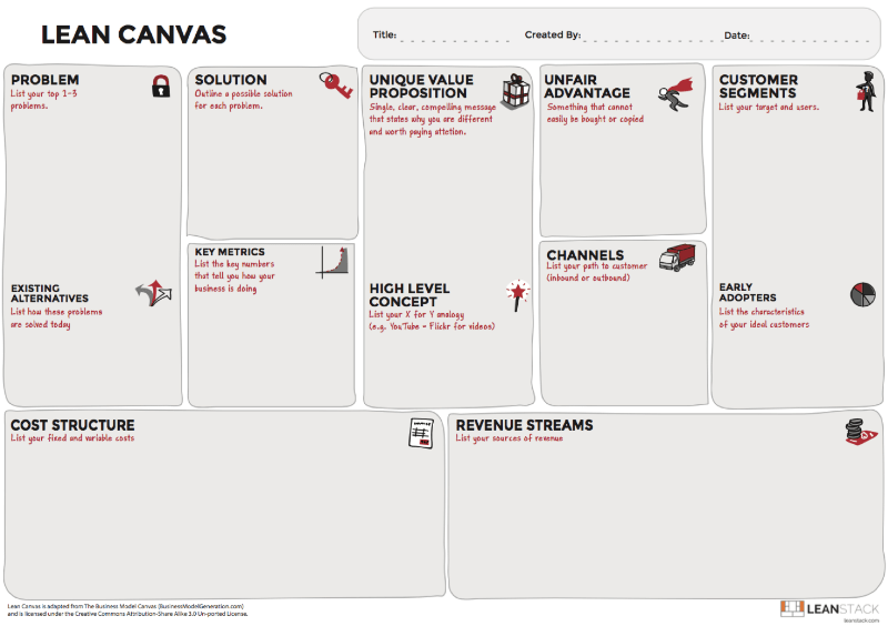 The “Startup Canvas” is particularly useful when you work at an early stage startup and are staring from scratch, both with the business and your product or service. There are lots of these canvases around for you to have a closer look at; I’d suggest having a look at the Business Model Canvas (by Alex Osterwalder) and the Lean Canvas (by Ash Maurya).