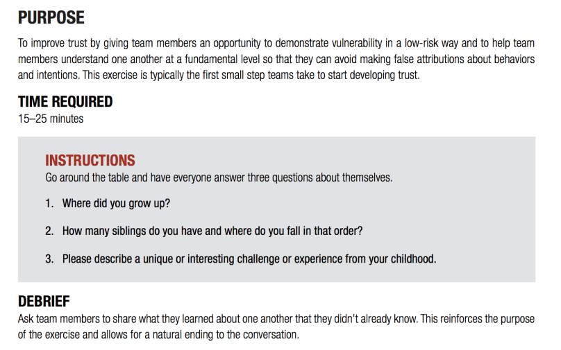People being open and honest with themselves and each other, instead of wasting time and energy on politics. Building up this level of trust is by no means an easy feat or one off exercise. In contrast, it’s best to start small – with The Personal Histories Exercise, for example and continue maintaining trust.