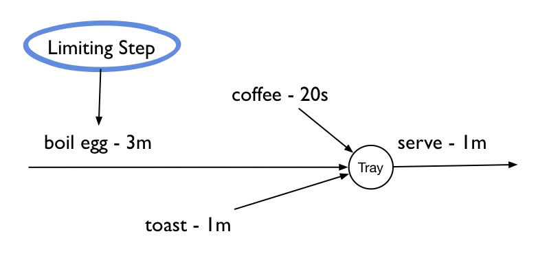 Identifying the “limiting step” – Grove defines the “limiting step” as the step in the overall shape of the production flow that will determine the overall shape of a company’s operations. In the book, Grove uses the simple example of a breakfast company, and highlights the time required to boil an egg is the critical component or the ‘limiting step’ in the production flow (see Fig. 1 below). The key idea here is to construct your production flow by starting with the longest (or most difficult, or most sensitive, or most expensive) step and work our way back. As a (product) manager you’ll thus focus on the limiting step within your context, e.g. in the workflow of your team, the customer funnel or the decision-making process.