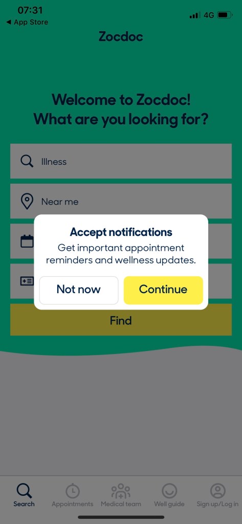 How does ZocDoc explain itself in the first minute? Unlike other apps, I’m not entirely clear about what ZocDoc is all about. Perhaps I’m slightly distracted by the overlay message which asks me whether I want to accept notifications to “Get important reminders and wellness updates”: