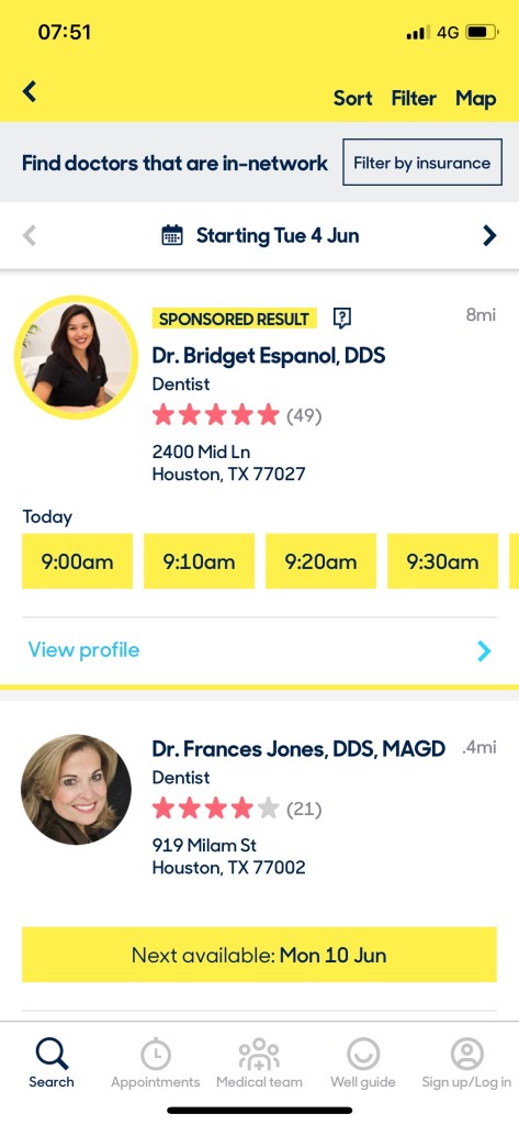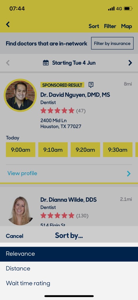 Instead, results can be sorted based on “relevance” – although when I do this I start getting results with dentists who aren’t available today (which was one of the original filters) – “distance” and “wait time rating”.