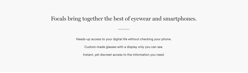 How does North explain itself in the first minute? – Focals. Smart glasses that put fashion first” is the strap-line above the fold on the homepage of https://www.bynorth.com/. The combination of the word “smart” in this strap-line and the picture of a Google Glass like pair of glasses tells me that this site sells glasses that display information in a hands-free fashion.