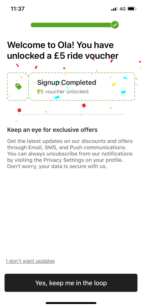 Getting started with Ola? Getting started with Ola is painless and feels very similar to on-boarding many other apps. Call me a simpleton, but I do like the little animation at the end, which celebrates my completing Ola’s signup process and receiving a £5 voucher in the process. Hold on though, didn’t the opening screen of the app mention being able to receive vouchers up to £15!? What else do I need to do in order to get an additional £10 worth of vouchers?