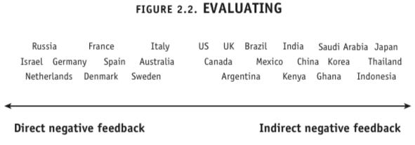Meyer’s Evaluating scale offers important insights into how to give effective performance appraisals and negative feedback in different parts of the world. She outlines a spectrum ranging from “direct negative feedback” to “indirect negative feedback”. With direct negative feedback, the feedback is delivered to a colleague frankly, bluntly and honestly. Negative messages stand alone, not softened by positive ones. In contrast, when indirect negative feedback is provided it’s done in a soft, subtle and diplomatic manner.