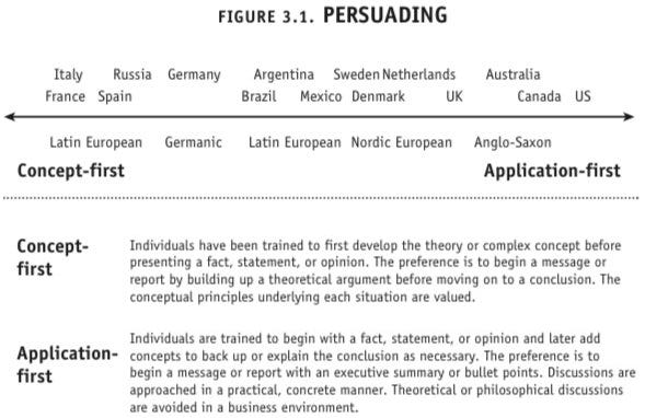 There are two types of reasoning we can use to persuade; principles-first and applications-first reasoning. Principles-first (or deductive) reasoning derives conclusions or facts from general principles or concepts. With applications-first reasoning (or inductive) reasoning, general conclusions are based on a pattern of factual observations from the real world. Meyer explains that people fro principles-first cultures generally want to understand the why behind their boss’s request before they move to action. Applications-first learners tend to focus less on the why and more on the how.