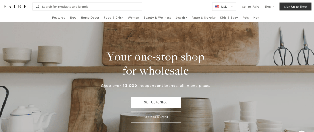 How does Faire explain itself in the first minute? When I go to the Faire website it says “Your one-stop shop for wholesale” on its homepage, above the fold. This strap line is followed by two calls to action: “sign up to the shop” and “apply as a brand”. There are over 13,000 brands selling their products on Faire.