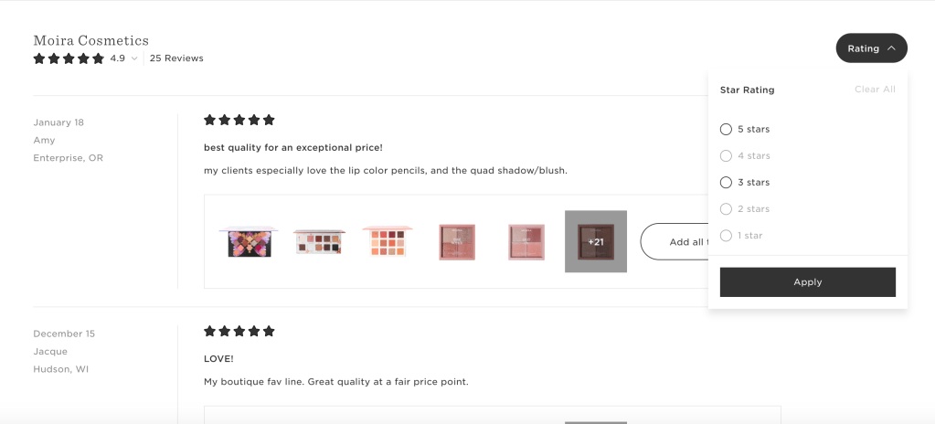 People can read more about Moira Cosmetics, their story and brand values. Interesting that the buyer reviews have a visual of the relevant products purchased, which can be added to bag, straight from the review.