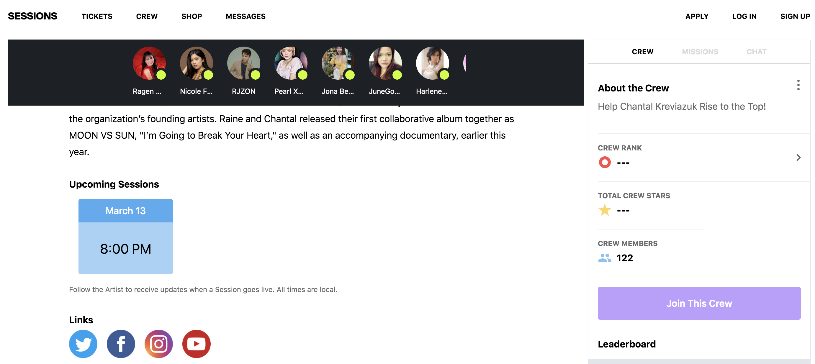 It doesn’t become immediately apparent how Sessions works; for the artists that want to use the platform for live streaming or for the people who want to watch a live session. However, after joining the crew of an artist called “Forrest”, I receive an email outlining the benefits of joining Forrest’s crew.