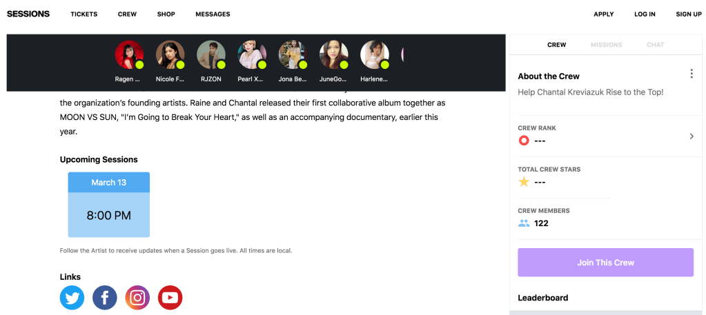 How does Sessions work? I can see how users can get tickets for live streams of artists sessions. Not sure how the different social aspects – “crew” – and gamification elements – “crew rank” and “leaderboard” – work. I guess I’ll have to sign up to Sessions in order to find out.