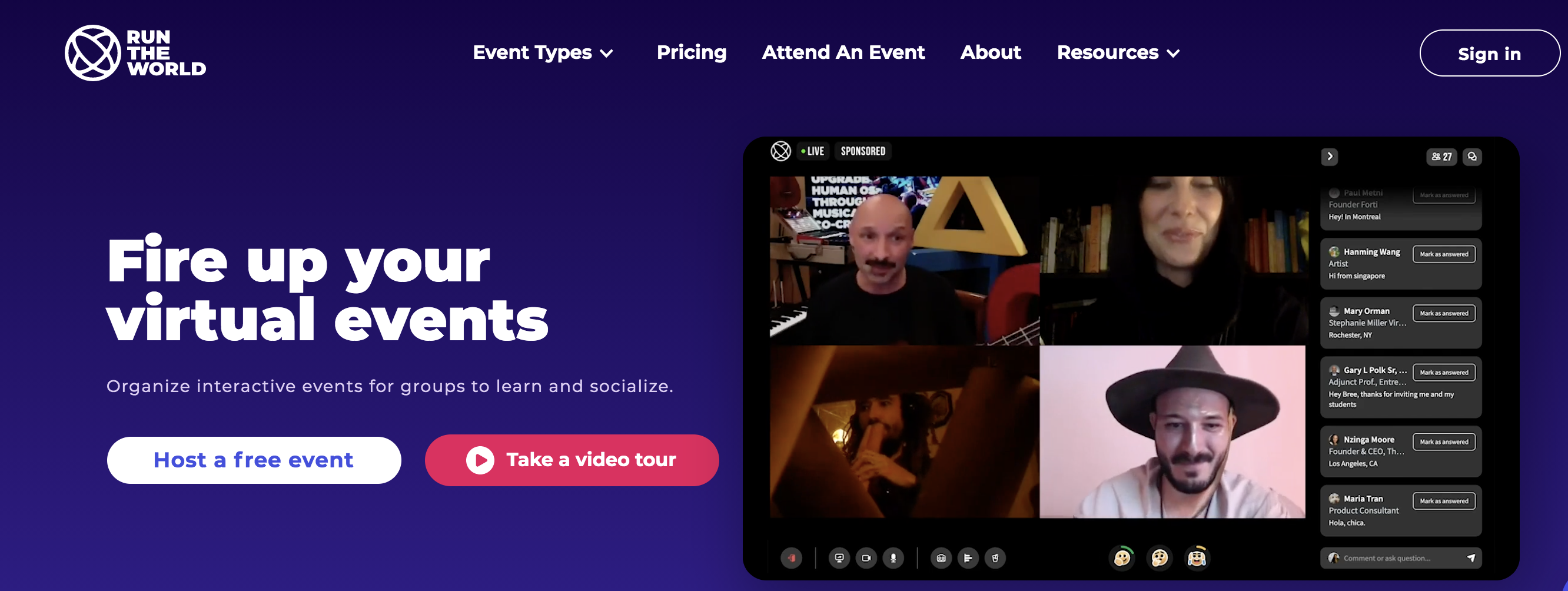 How does Run The World explain itself in the first minute? The first thing I see when I go to the Run The World site is a strap-line which says “Fire up your virtual events”, followed by “Organize interactive events for groups to learn and socialize.” At this point, I can already create a free event to host or take a video tour first.