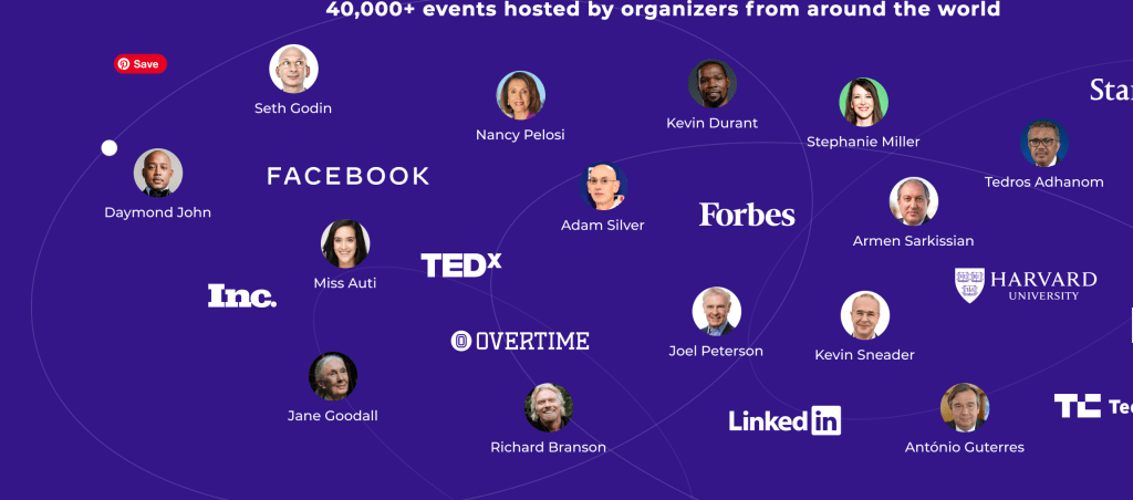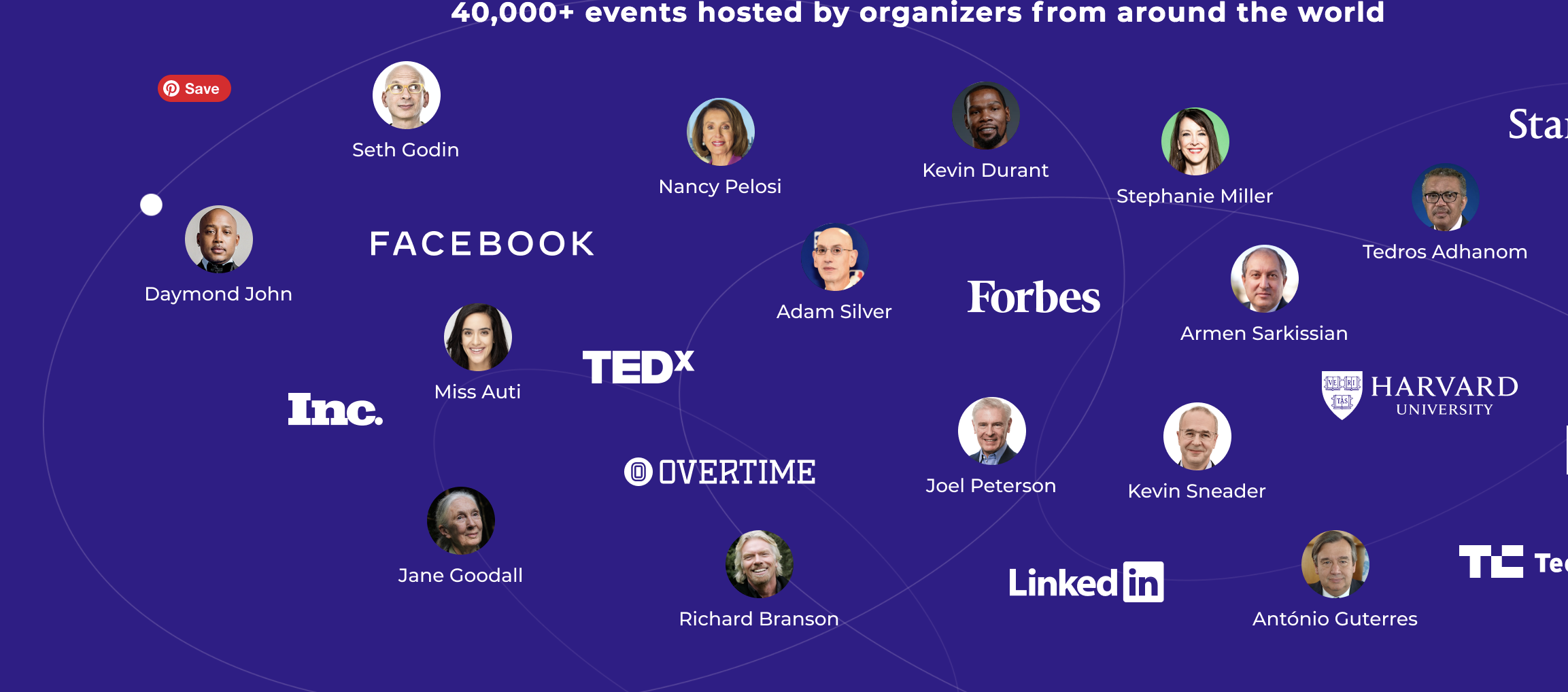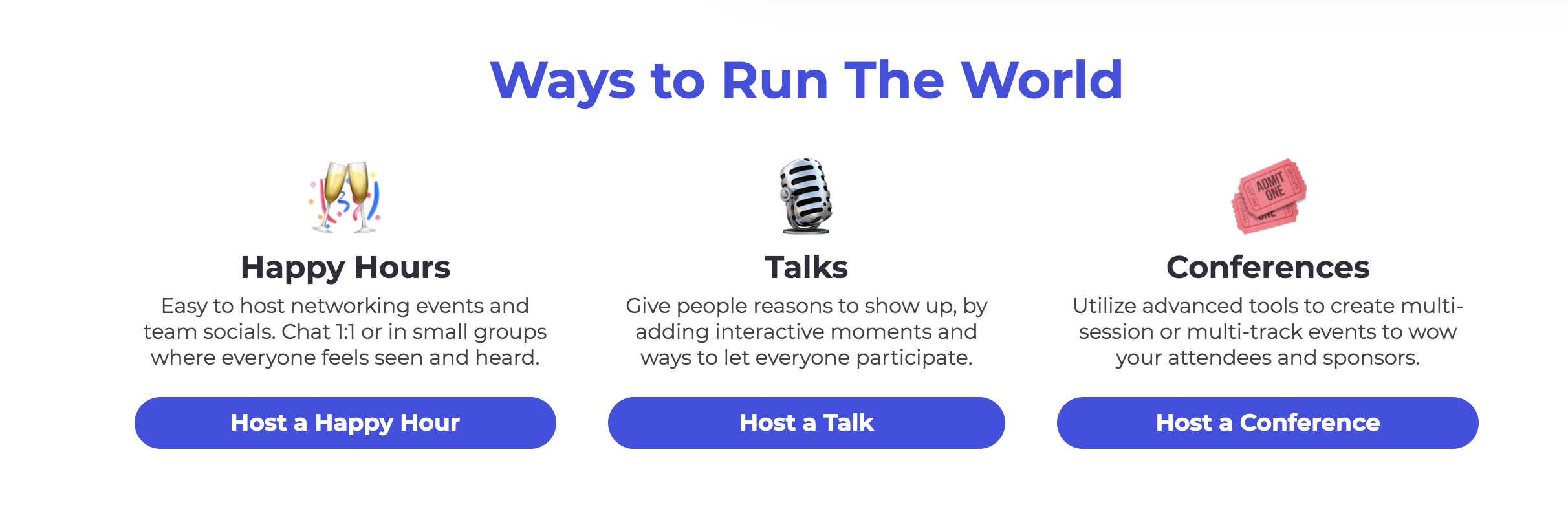 When I scroll down on the Run The World homepage, I see that are three different ways to run the world: hosting a happy hour, hosting a talk or hosting a conference. Also, there’s a section with social proof of those people that have used Run The World previously to host an event.