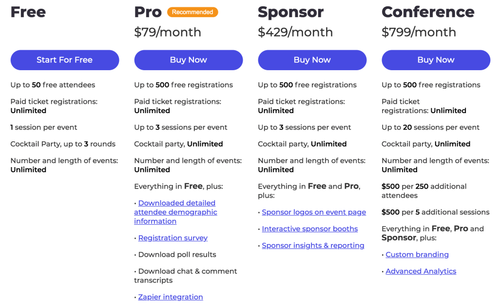 Run The World’s pricing plan ranges from “Free” to “Conference”, with ‘number of attendees’ and ‘sessions per event’ acting as the main pricing levers. Naturally, the number of features and level of customisation increases per subscription level. For instance, the ability to get attendee insights is a key one for those event organisers who wish to grow their attendee base and iterate on the quality of their events.
