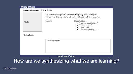 In addition to experience maps, Torres stresses the importance of ‘continuous interviewing’. She distinguishes between what you’re trying to learn (your research questions) and what you’re asking in a customer interview (interview questions). The primary research question in any interview should be: What need, pain points, and desires matter most to this customer? (and why)