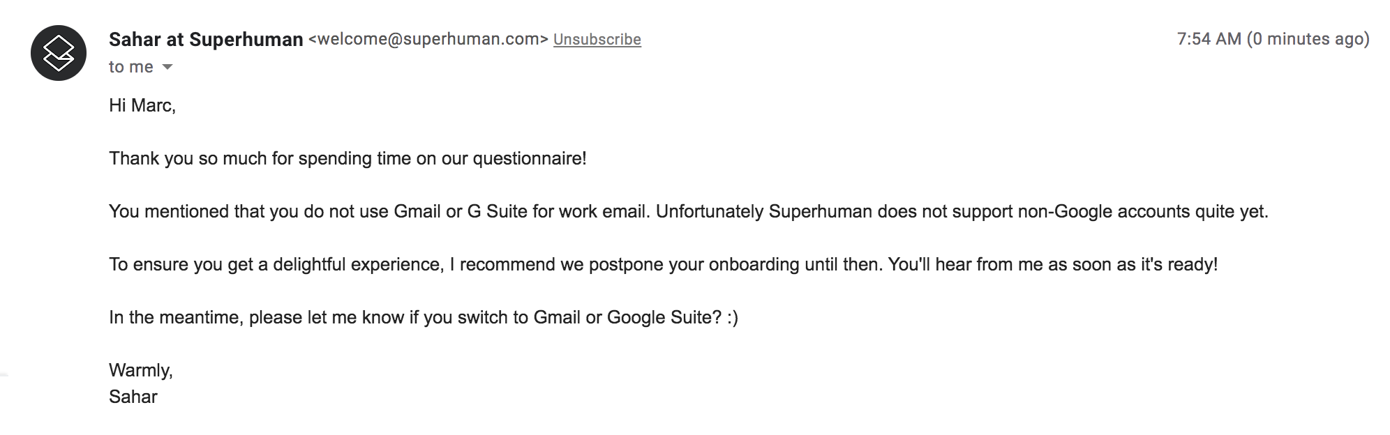When I scroll down, it says that Superhuman isn’t just another email client. There are claims that the Superhuman inbox is gorgeous and its email service “blazingly fast”. Once I’ve registered my email with Superhuman, I receive and email from Rahul Vohra, Superhuman’s Founder & CEO. In this automated message, Vohra tells me more about Superhuman and shares a questionnaire to help me get started on Superhuman. I presume this questionnaire to be about my email habits and preferences, thus creating my inbox and preferences from scratch.